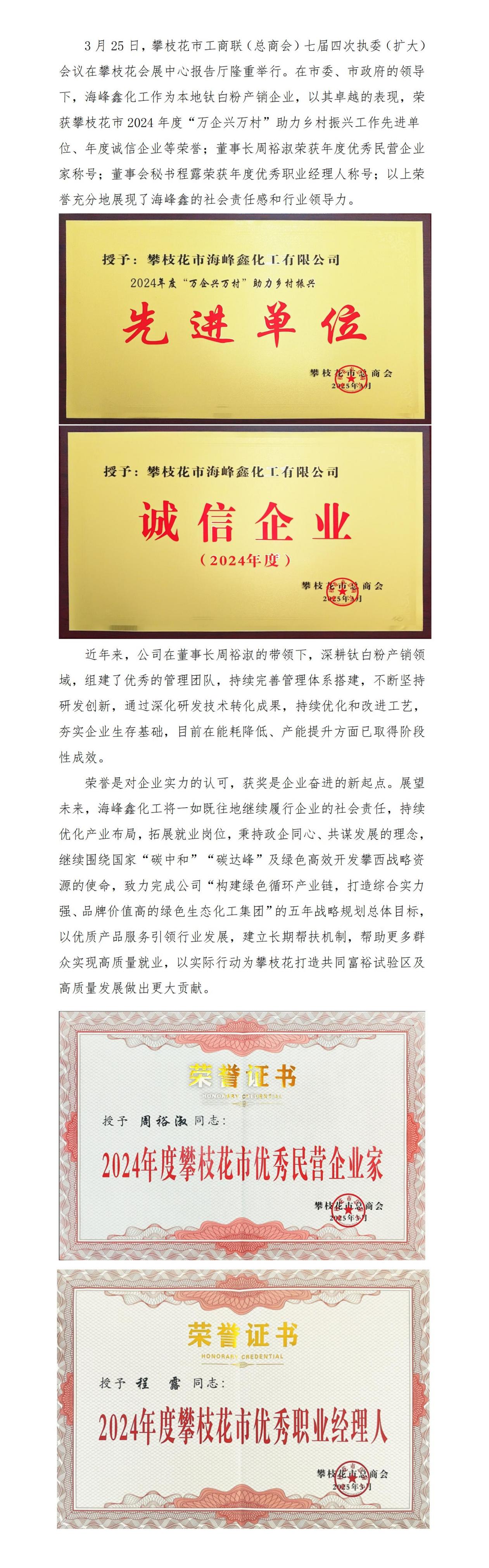 【喜報】海峰鑫化工榮膺攀枝花市總商會多項榮譽稱號